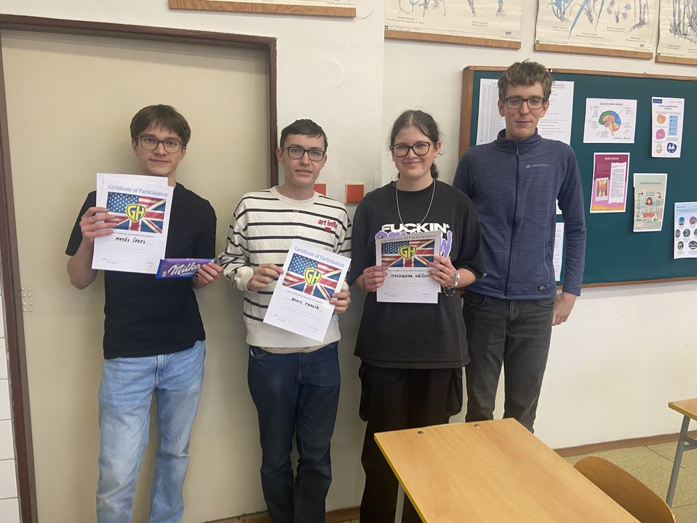 V předvánočním týdnu se na našem gymnáziu uskutečnila soutěž v anglické konverzaci. Nejdříve jsme si otestovali studenty poslechem a ti nejlepší se poté zúčastnili ústní zkoušky. Všem studentům, kteří se do soutěže zapojili, moc děkujeme a výhercům blahopřejeme a těšíme se na další reprezentaci naší školy v okresním kole v Pelhřimově.