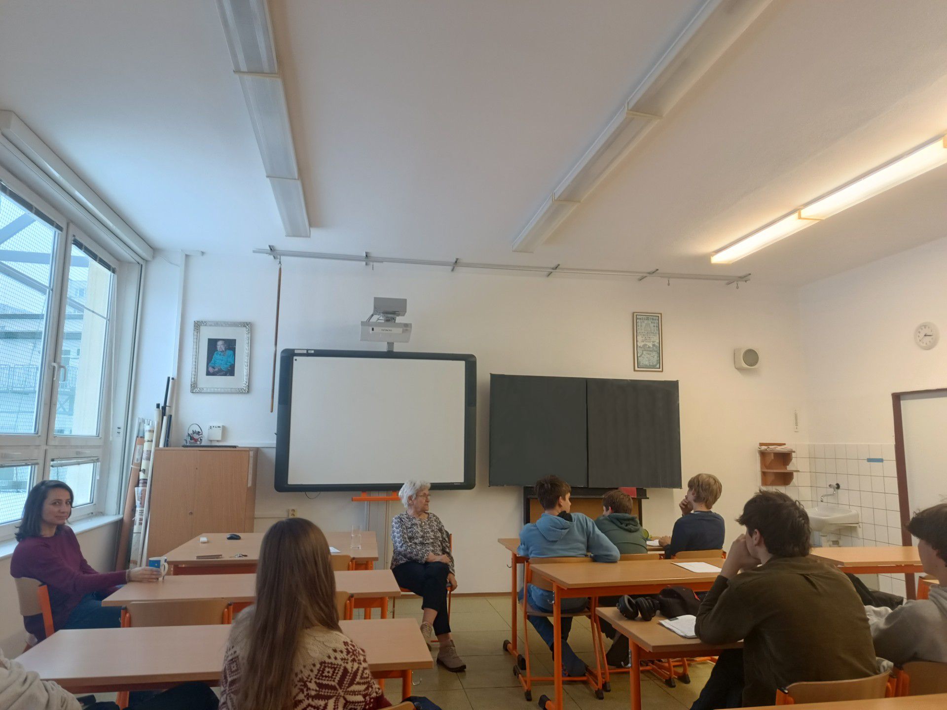 V pondělí 26. listopadu pak na gymnáziu proběhlo promítání filmu Aleny Hynkové Neznámí hrdinové: Ta krásná holka z vily nad řekou a následná beseda s pamětníkem v rámci projektu Jeden svět na školách. Studenti dějepisného semináře a další zájemci využili možnosti vyptat se na životní zkušenosti paní Tošerové, které děkujeme za příjemnou návštěvu a její vzpomínky. Spolupráce s ní bude pokračovat v rámci již tradičního projektu Příběhy našich sousedů, na což se těšíme.