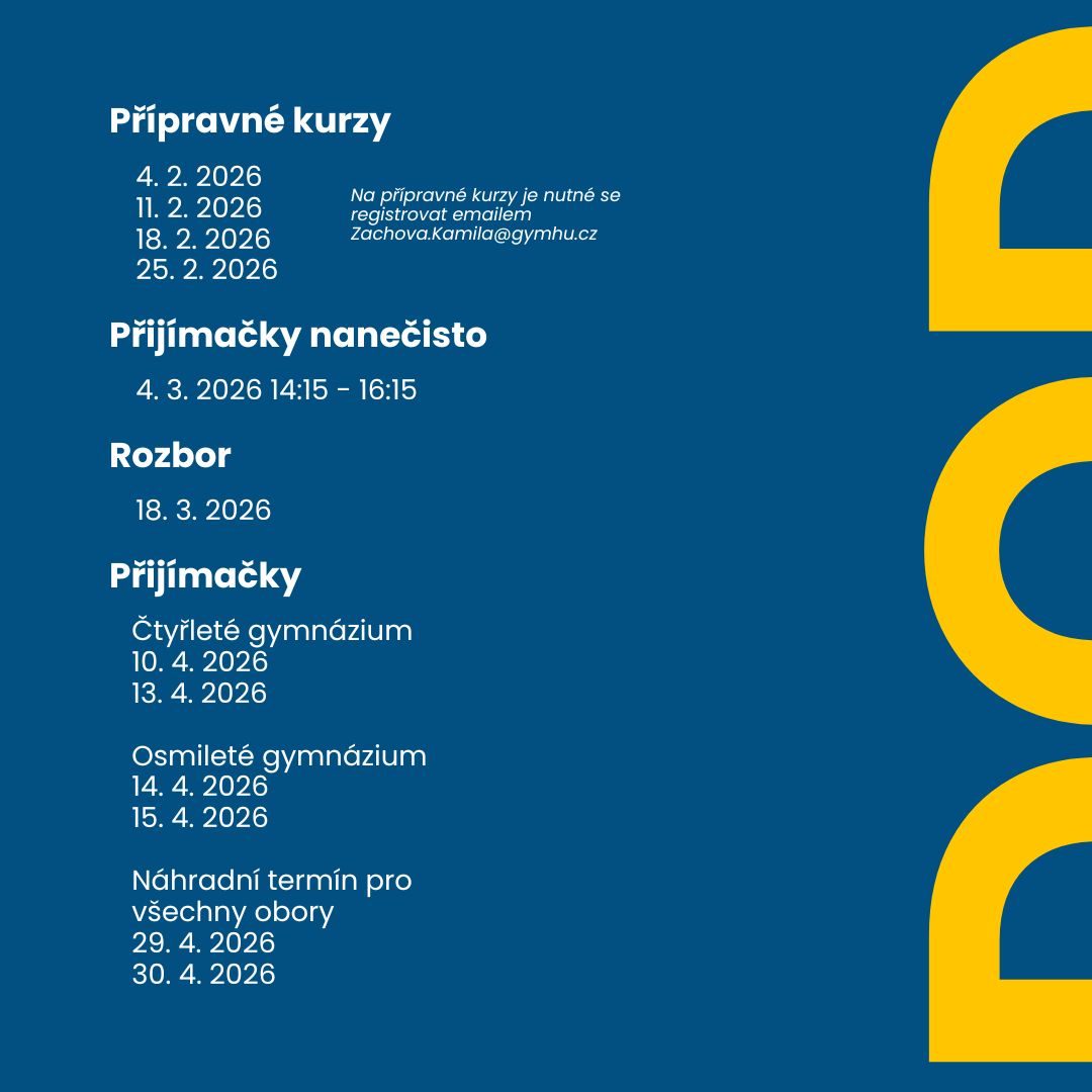 Stejně jako v předcházejících letech jsme připravili sérii přípravných kurzů z matematiky a českého jazyka, které se budou konat vždy od 14.30 do 16.15 hod., a to ve dnech 4. 2., 12. 2., 18. 2. a 25. 2. 2026. Kurzy se zaměří na opakování stěžejních znalostí a strategií potřebných pro úspěšné složení jednotných přijímacích zkoušek. Nepřehlédněte: Pro účast na přípravném kurzu je třeba se zaregistrovat emailem na adresu Zachova.Kamila@gymhu.cz Do emailu uveďte jméno a příjmení uchazeče, školu a třídu, kterou uchazeč navštěvuje.